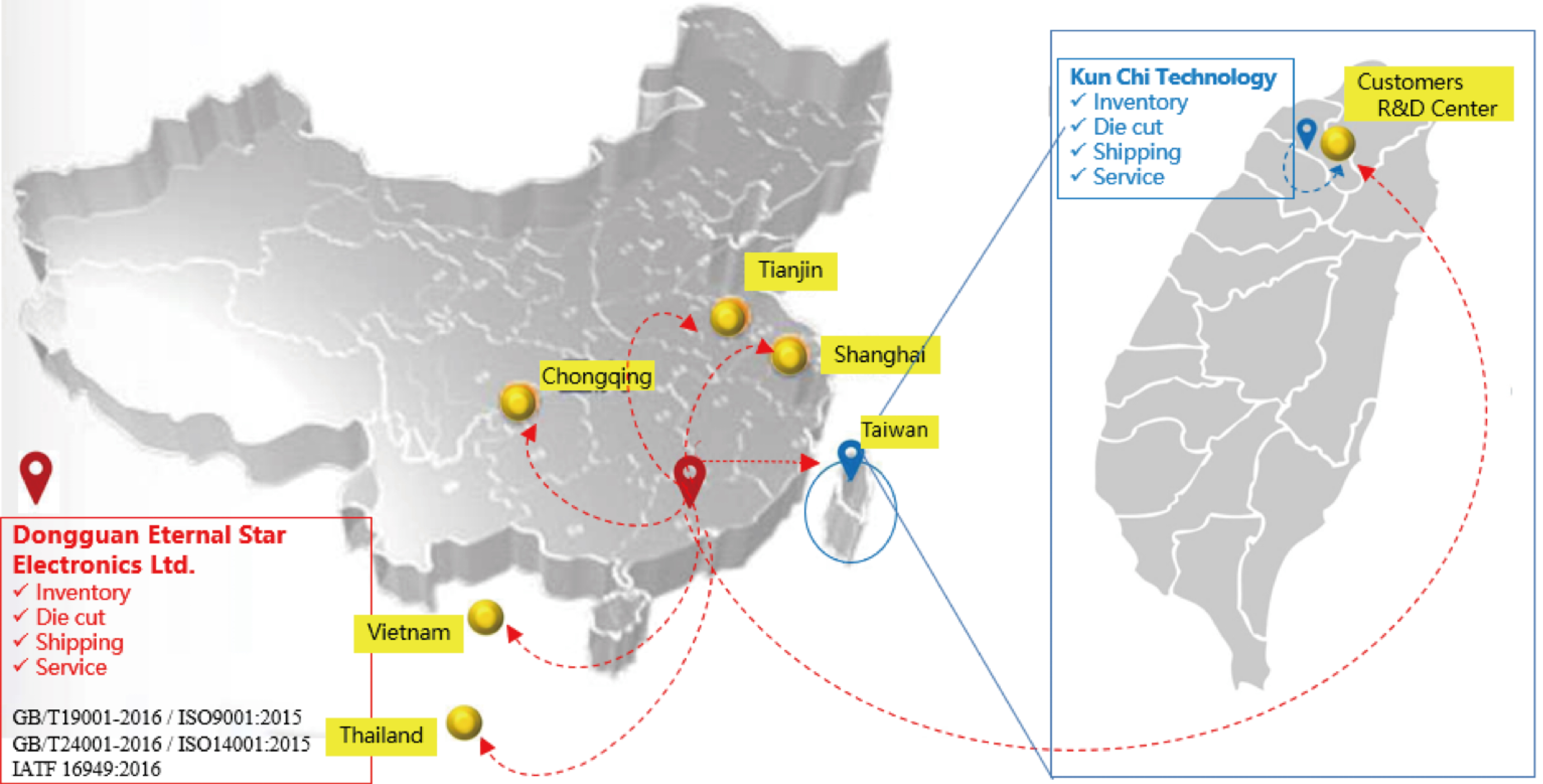 2008 年成立東莞長盟電⼦有限公司迄今,長盟提供導熱材料的專業服務, 並投入業務⼈⼒、模切加⼯、導熱膏(凝膠)的分裝及物流資源, 逐年穩定成長。 因應市場拓展需求,於 2011 年在台灣設立琨奇科技有限公司, 持續深耕客⼾關係。